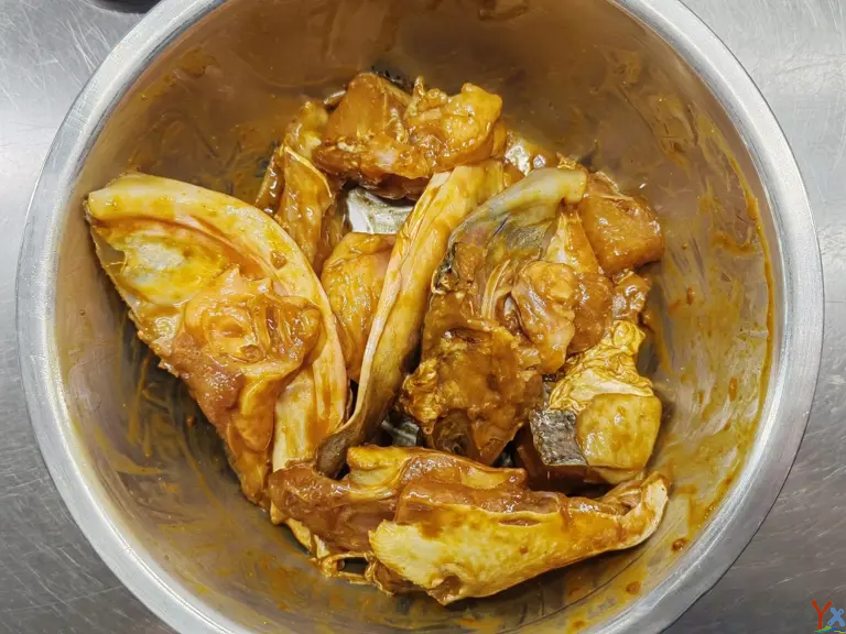 3、鱼头控干水了,酱料也准备好了,接下来就可以对鱼头进行腌制,把鱼头倒进一个大盘中,把灵魂酱料倒在鱼头的上面,然后捞拌均匀,让每一块鱼头都能裹上料汁。搅拌均匀后加入6克玉米淀粉,搅拌均匀。搅拌均匀后加入10克芝麻香油,搅拌几下,搅拌均匀后放一旁腌制15分钟。