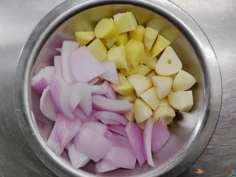 【配料】:蒜子50克、生姜40克、洋葱80克、香菜梗7克、小葱7克、红辣椒10克。