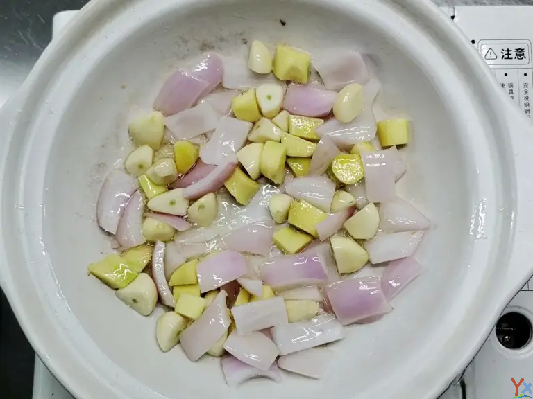 1、砂锅中加入20克花生油和20克猪油,大火把油烧热,油热后把蒜子、生姜和洋葱倒进锅内煸炒一下,大概炒30秒左右炒出香味。