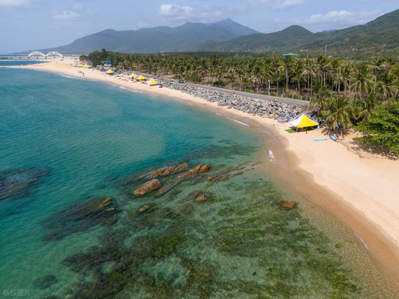 日月湾的椰林公路,一半大海一半椰林,沙滩餐吧氛围感拉满。