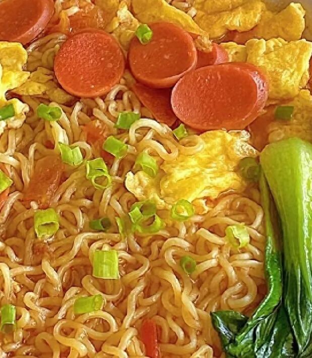 两个鸡蛋炒熟盛出备用,油热葱蒜末炒香,番茄丁炒出汁。倒入适量清水,生抽,盐,蚝油调料包,水开泡面,鸡蛋,火腿,青菜咕嘟煮1分钟就可以开吃了。