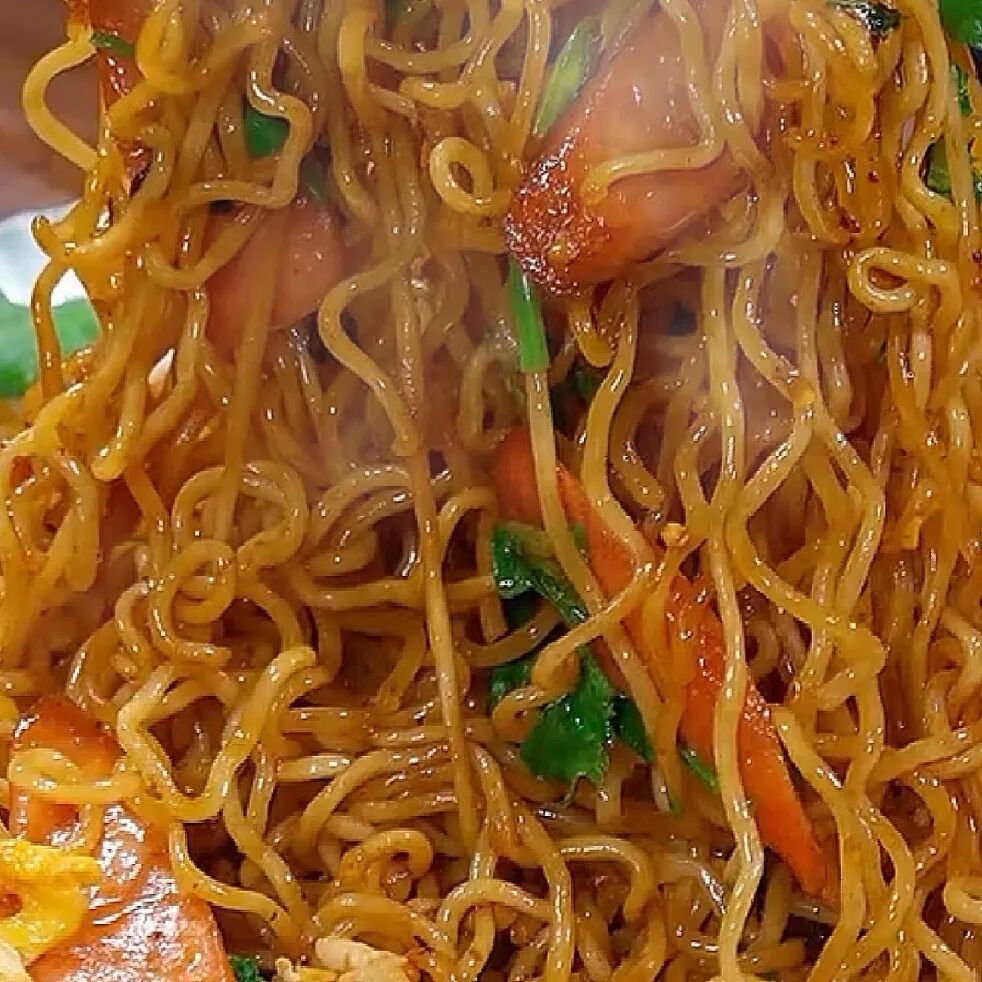 方便面敲碎倒入碗中,再放入调料包。少许水开水泡面,油热下鸡蛋炒散,火腿肠,剩米饭泡面炒至粒粒分明调味,只要生抽大火翻炒几下,撒点葱花即可。