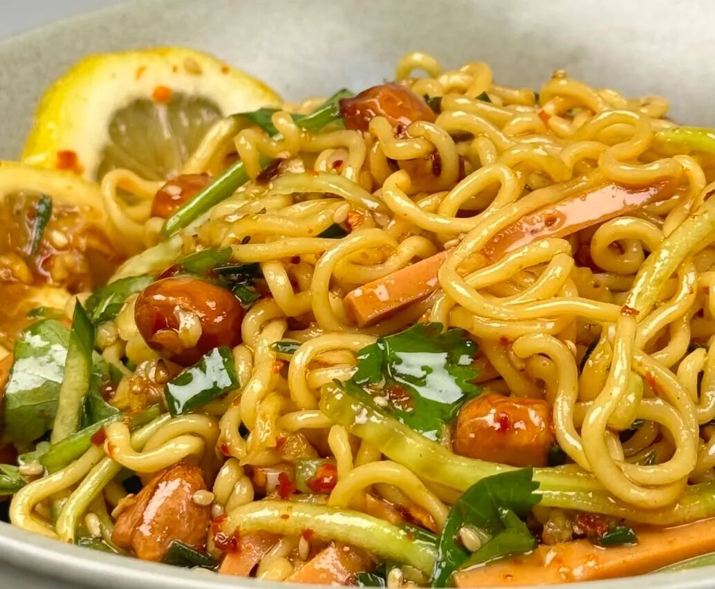 水开下泡面煮。至八成熟捞出过一下凉水更筋道,好吃的关键就是这个灵魂料汁,碗中放葱花,蒜末,小米辣,辣椒面,白芝麻淋入热油炸香,一勺生抽,一勺陈醋,蚝油,盐,鸡精,白糖,一勺老干妈。三片柠檬,半罐雪碧,搅匀后淋在煮好的面条上,然后放黄瓜丝,火腿丝,花生米,香菜拌匀即可开吃,