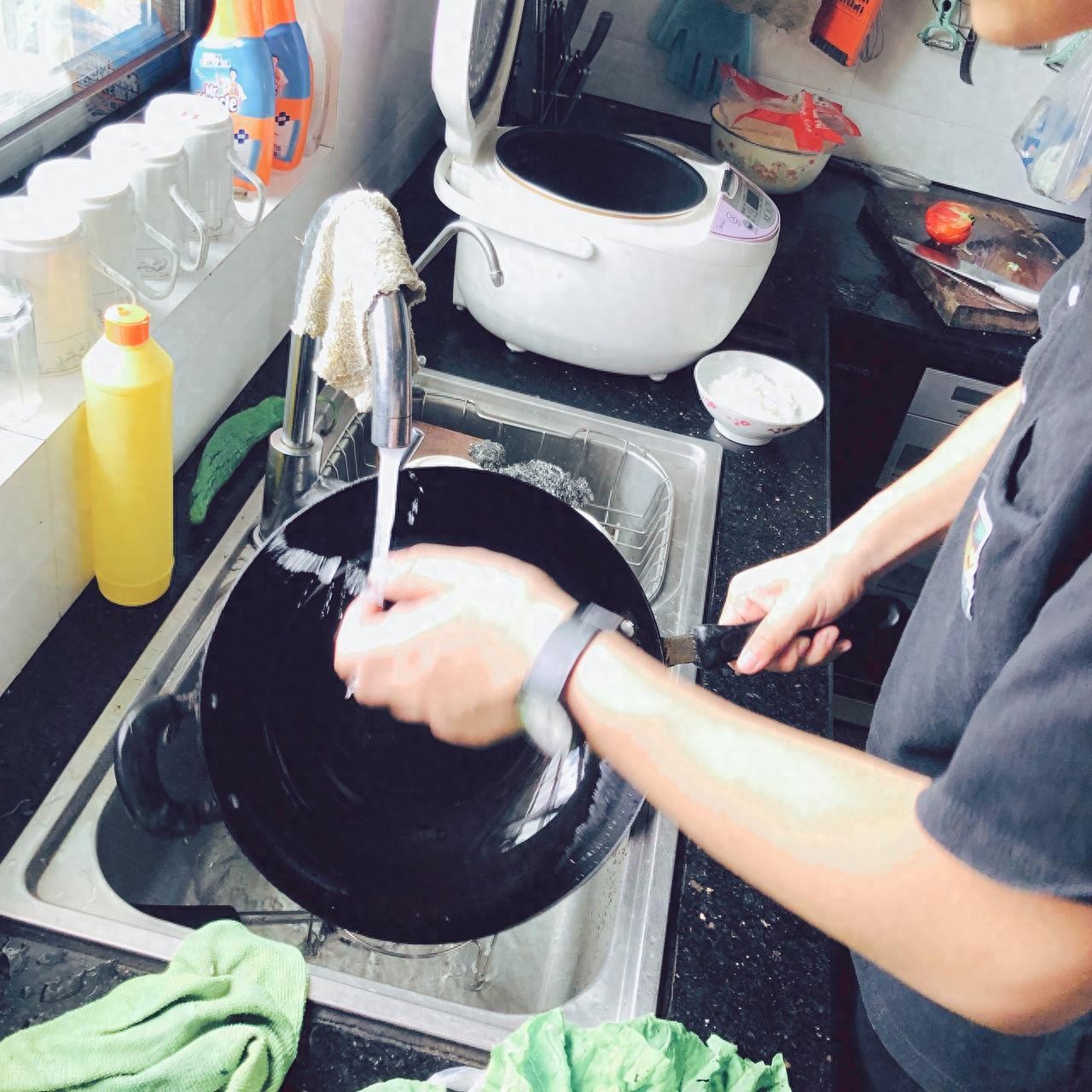 洗锅的正确做法是先让锅自然放凉几分钟,温度下降到60度以下再用温水冲洗,既能避免锅裂,也能减少油烟水汽对呼吸道的刺激。
