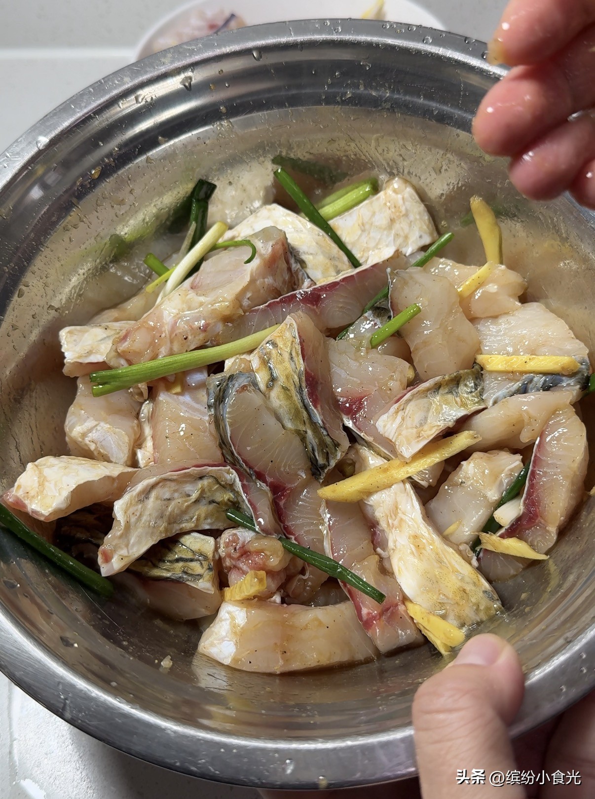 所以腌制新鲜的鱼肉,我们只需要用道姜丝和葱段就够了,用手把葱姜汁水抓出来,再拌到鱼上,效果会好很多。腌鱼块和鱼片的时候,还可以加少许白胡椒粉或者花椒粉,少量放一点可以去腥增香。