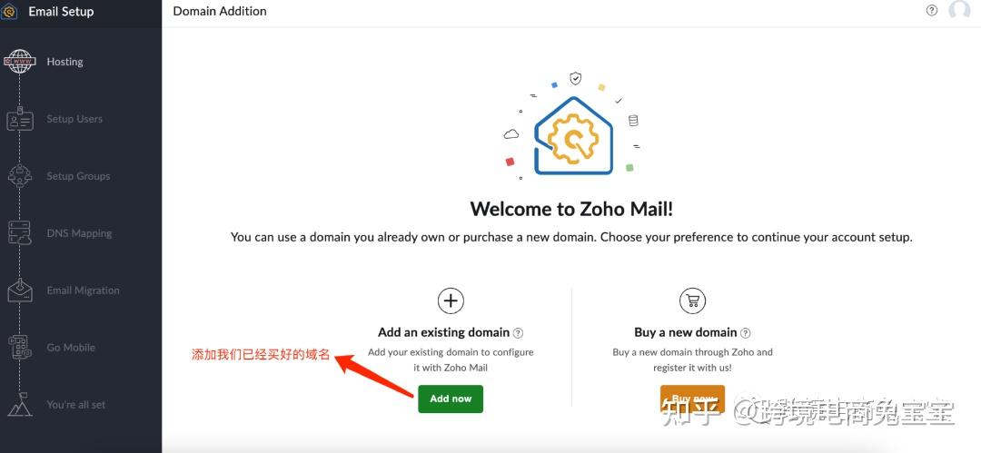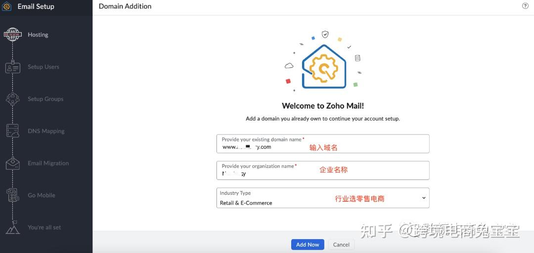 点击绑定已有域名(我域名在Namecheap买的,Zoho也可以直接买域名,贵一点),输入域名,企业名称,选择行业,然后就绑定上了。