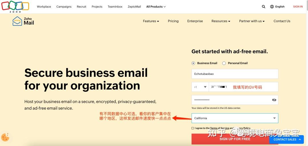 注册地址:https://www.zoho.com/mail,选择默认的Business Email,就是我们的企业邮箱(域名邮箱),输入用户名(后面也可以修改),电话(中国手机号应该也可以),选择数据中心(理论上挑个离用户近的数据中心邮件收发速度可能会快那么一点点点..... )