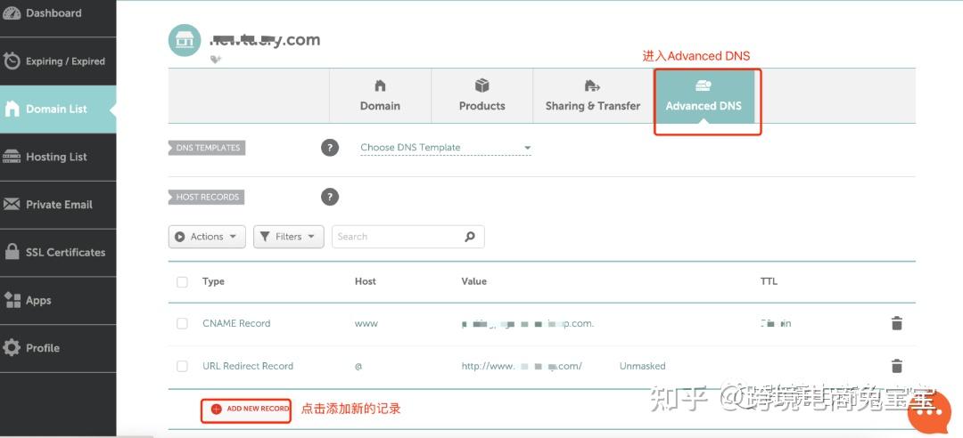2、进入Advanced DNS,在HOST Records那里点击ADD NEW RECORD添加新的记录。