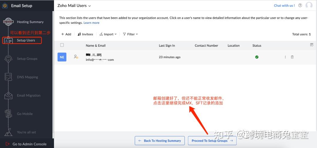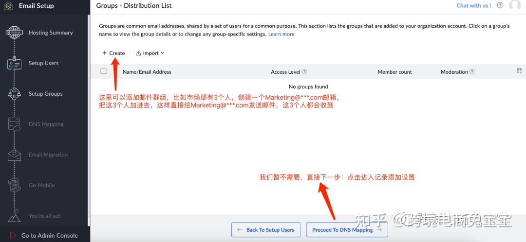 在这一步还可以创建群组,比如市场部有10个人,我们创建一个Marketing@***.com的邮箱,直接给这个邮箱发信,10个人都能收到,我们暂不需要,直接进入下一步添加MX SPF DKIM记录(这步不难就是比较繁琐,深吸一口气 )