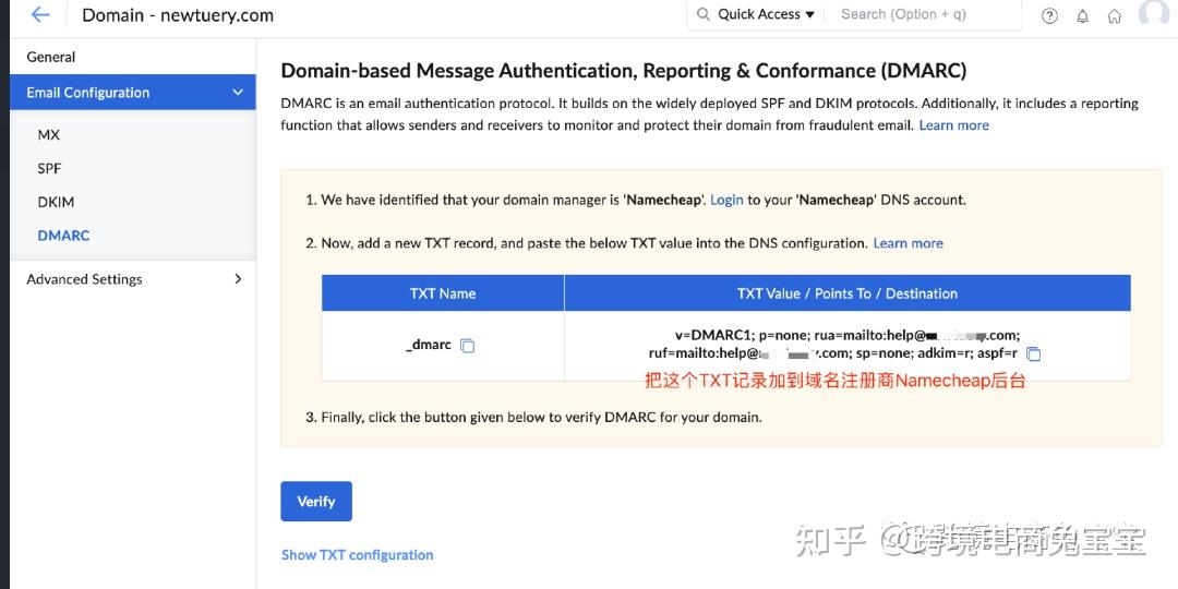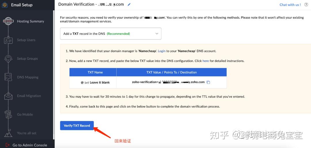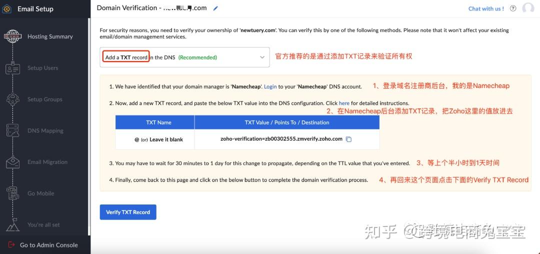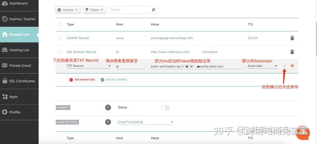 域名所有权验证,我们用官方推荐的通过在域名后台添加txt记录就可以,下面演示步骤以Namecheap为例,其他域名后台步骤类似。