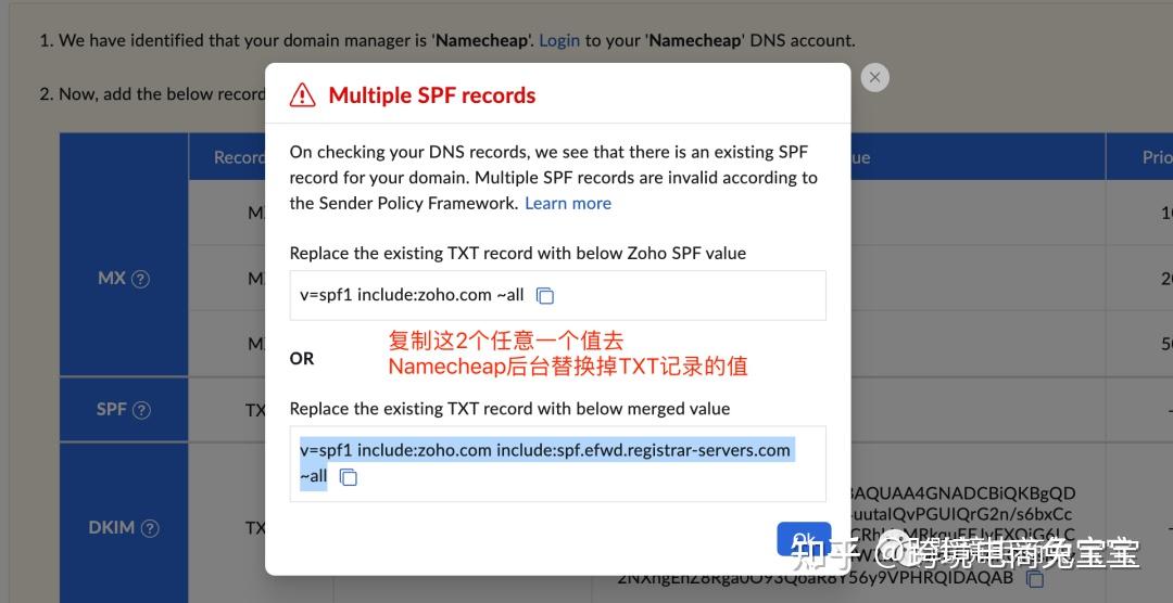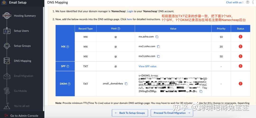 可以看到有3类记录要添加:3个MX,1个SPF,1个DKIM。添加的步骤和前面TXT Record一样的,都是去Namecheap后台把值粘贴过来。