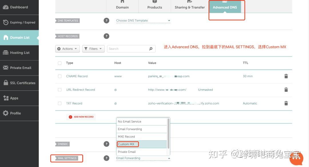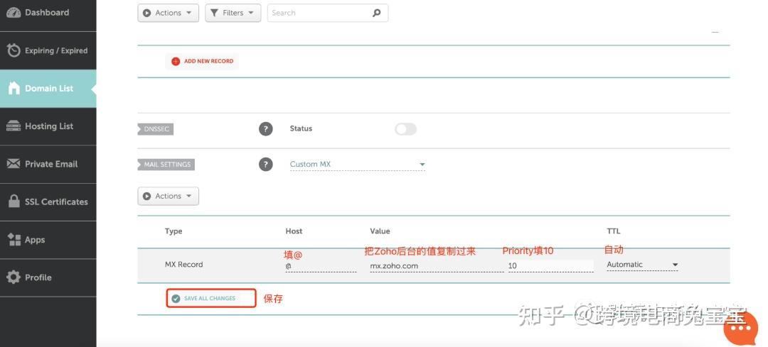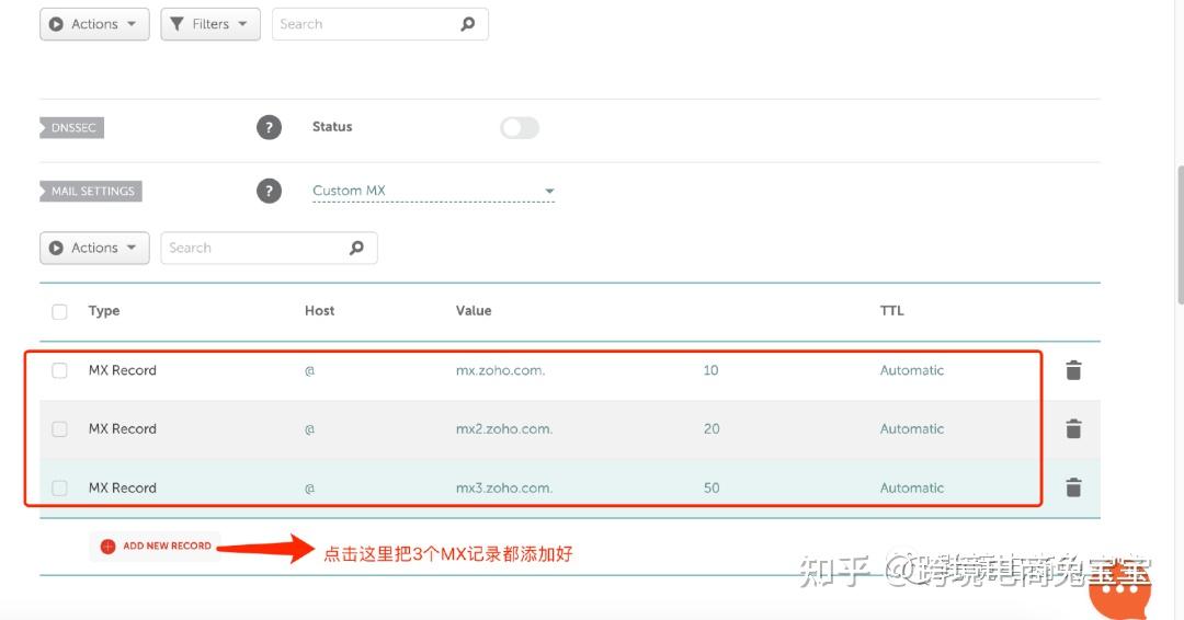 进入域名后台-找到对应域名-点击右侧Manage-Advanced DNS-MAILSETTING-Custom MX:Host填@,Value把Zoho后台的值粘贴过来,Priority写10,TTL默认Automatic,然后保存,剩下2个MX记录按上述步骤添加,不再赘述。