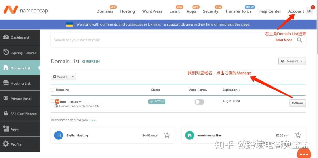 1、登录Namecheap后台,点击右上角Domain List进入,找到对应域名,点击右侧的Manage