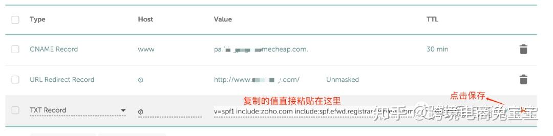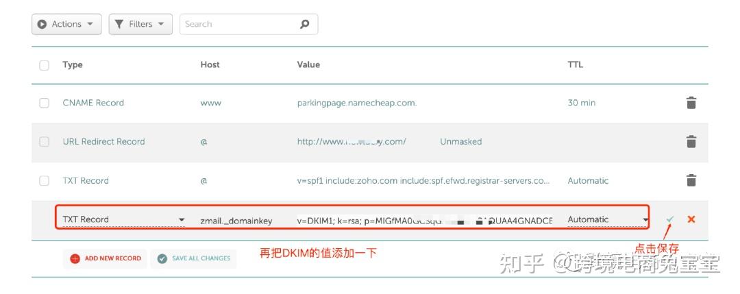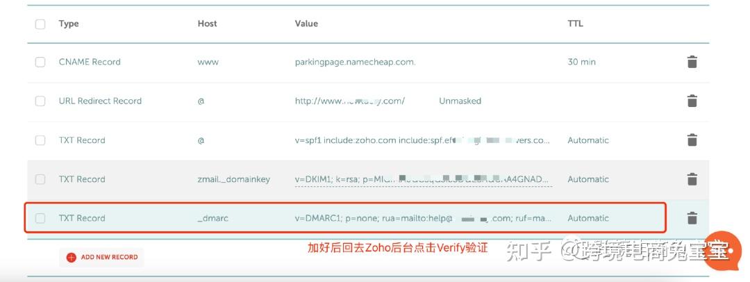 进入域名后台,找到Advanced DNS,再添加一条Txt Record:Type选Txt Record,Host粘贴Zoho后台的zmail._domainkey,Value值粘过来,点击保存。