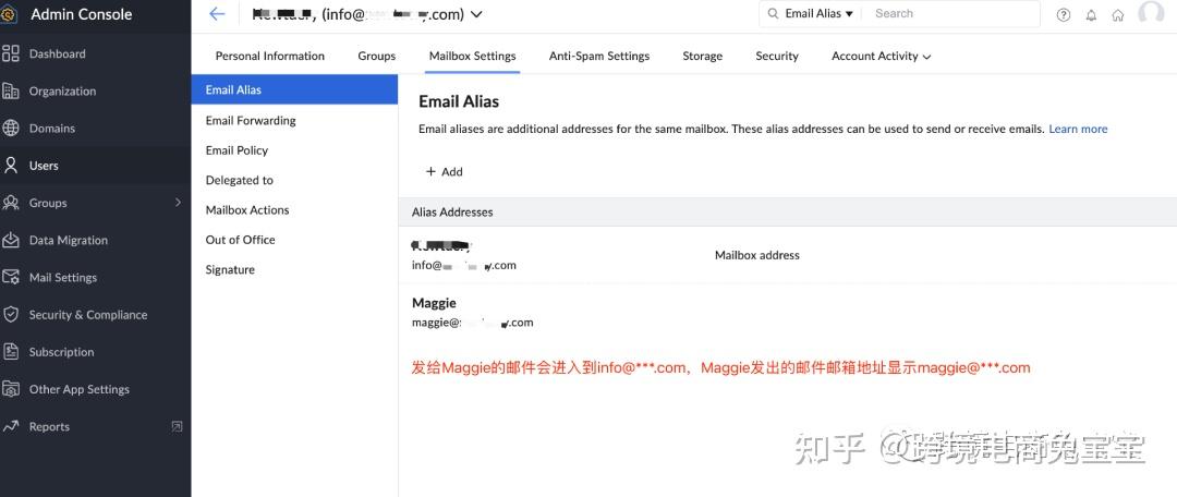 Zoho免费版虽然只有5个邮箱,但可以给每个邮箱创建别名邮箱,等于1个人有多个名字,张三是我,李四其实也是我(仔细一想有点分裂哈哈)。比如客服邮箱info@***.com,给它创建一个别名邮箱maggie@***.com,那么发给maggie@***.com的邮件都会进入到info@***.com,但是邮件往来显示的还是maggie@***.com。下面看一下怎么创建: