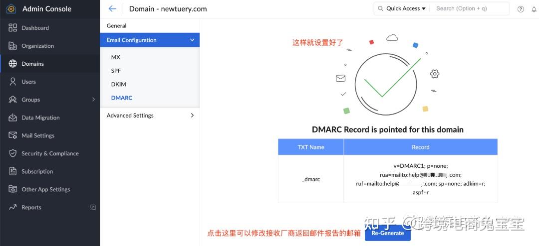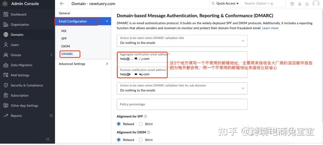 找到Email Configuration-DMARC,只要改Aggregagte和Forensic这2个地方的邮箱,这里邮箱是用来接收各大厂商返回的发送报告邮件的,每天都会有,建议填一个不常用的邮箱。