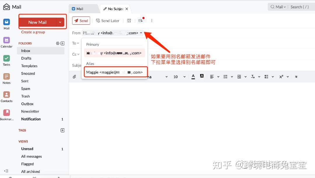 另外我们发送邮件时,可以在下拉菜单里选择用哪个别名邮箱发送邮件,有种互联网匿名的感觉