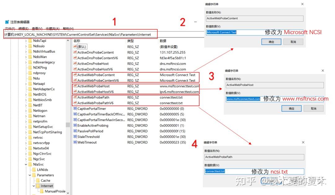Windows+R,窗口输入regedit,找到"计算机HKEY_LOCAL_MACHINESYSTEMCurrentControlSetServicesNlaSvcParametersInternet"文件,修改以下文件的数值数据,重新连接网络即可。