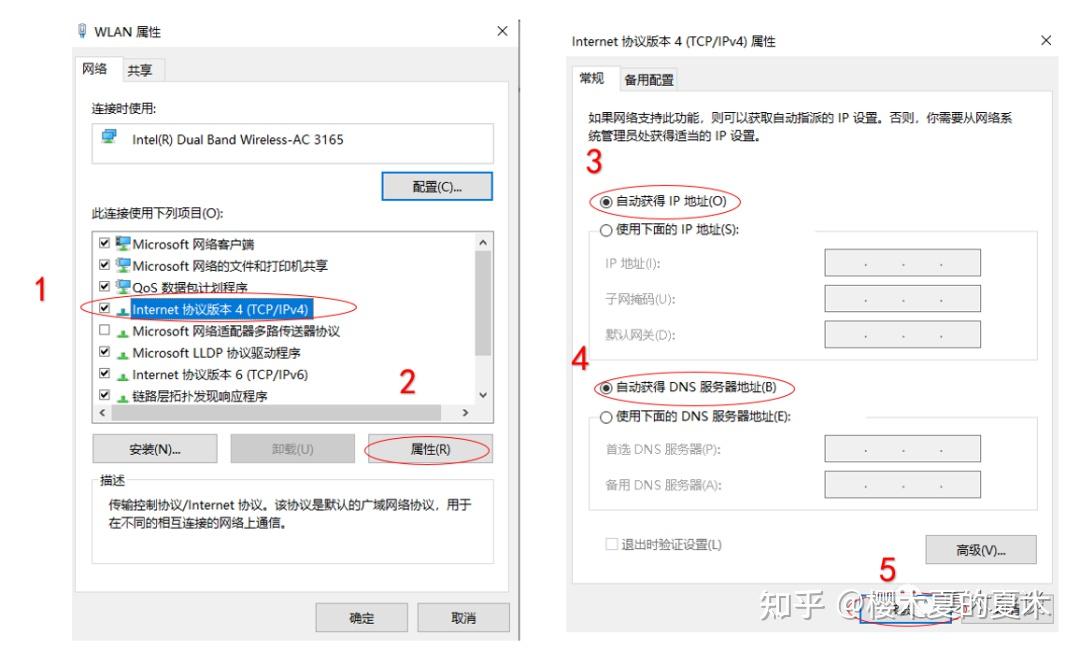 5、选择Internet协议版本4 ( TCP/IPv4),单机属性,选择自动获得IP地址和自动获得DNS服务器地址,单击确定即可