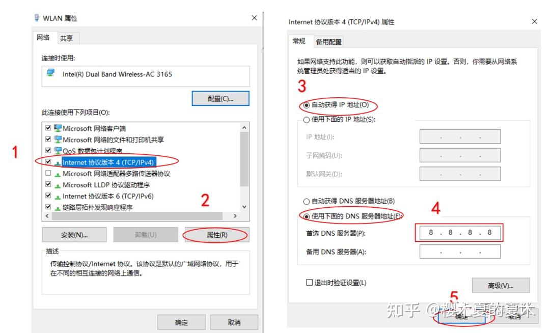 另一种教程同样使用修改Internet协议版本4 ( TCP/IPv4),前三步步骤一致,但是要将自动获得DNS服务器地址改为使用下面的DNS服务器地址,将地址改为四个8,然后点确定。
