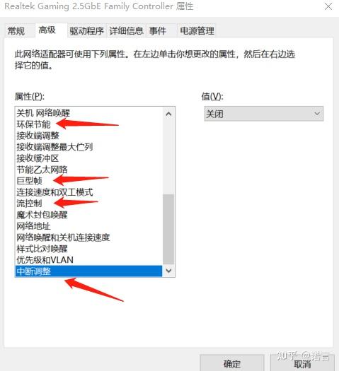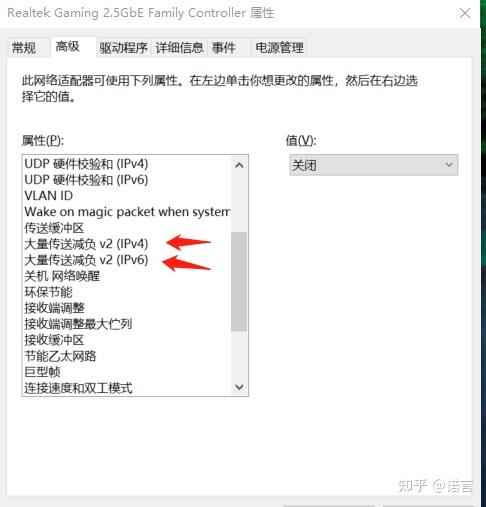 关闭流控制,巨型帧,中断调整,环保节能,大量传送减负 v2 ipv4, 大量传送减负 v2 ipv6,还有硬件校验和(下面图片这几个)