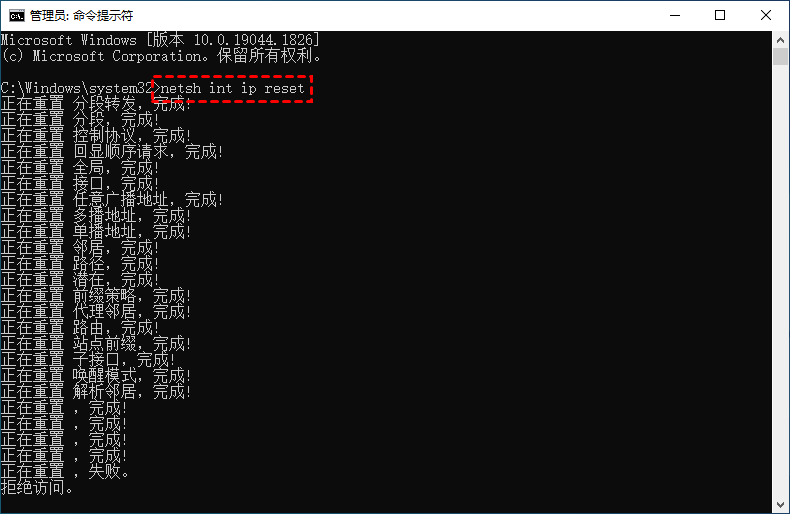 步骤2. 输入命令“netsh int ip reset”,然后按“Enter”键。