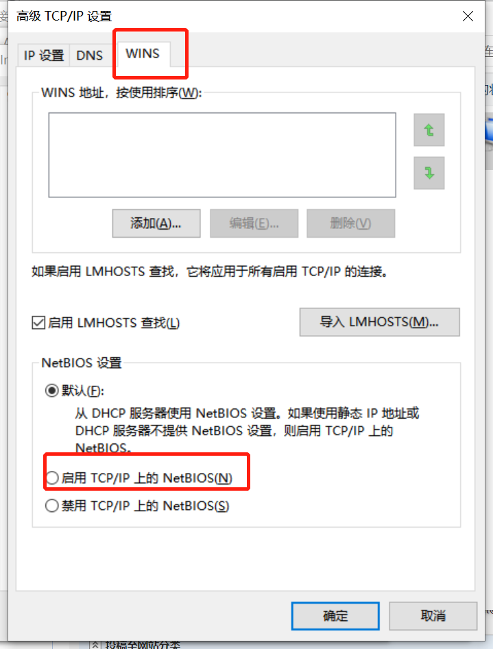 4.单击下方“高级”,选择“WINS栏”,看到下方的NetBIOS设置,一开始选中的是“默认”,我们需要把它改为“启用TCP/IP上的NetBIOS”,之后点击“确定