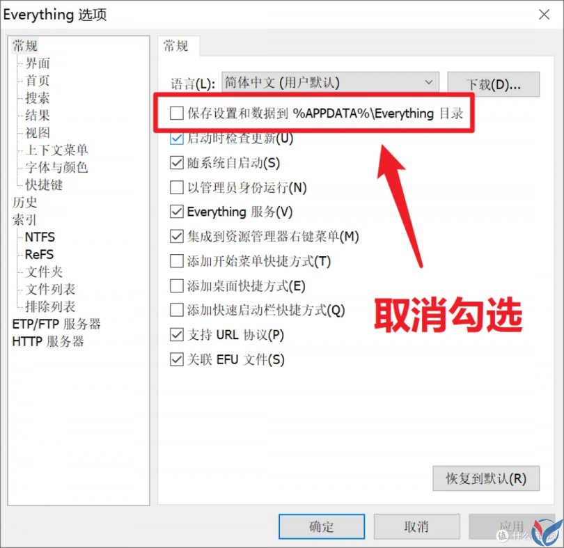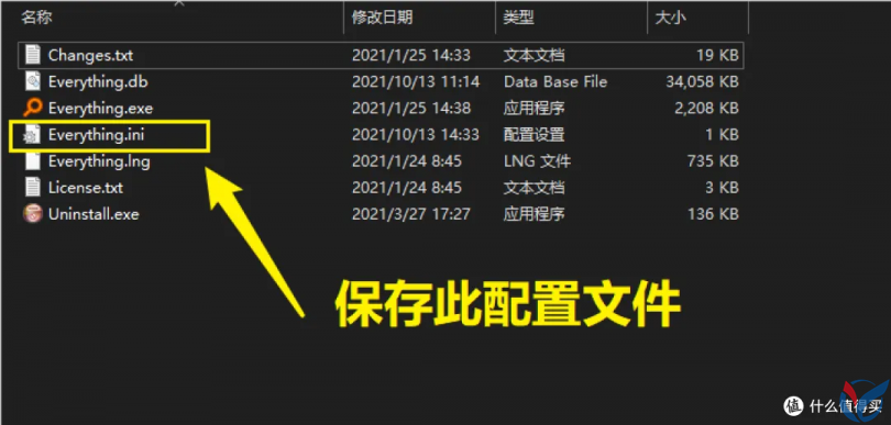 此时只需要将 Everything 安装目录下的 "Everything.ini" 文件进行保存到别的地方即可。