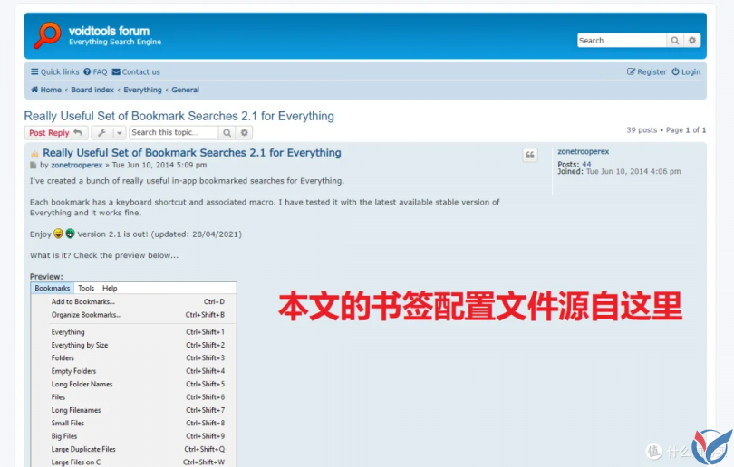 需要特别说明的是,UP提供的书签是从 Everything 官网论坛上下载的,UP 只是做了简单的翻译并搬运到这里,具体的原帖请看下面的链接: