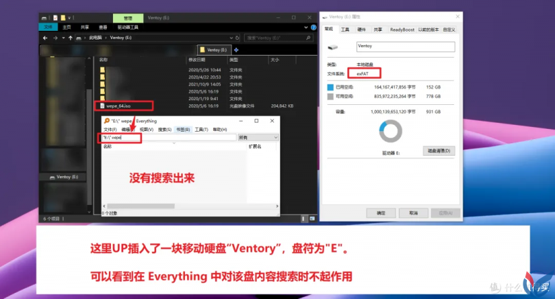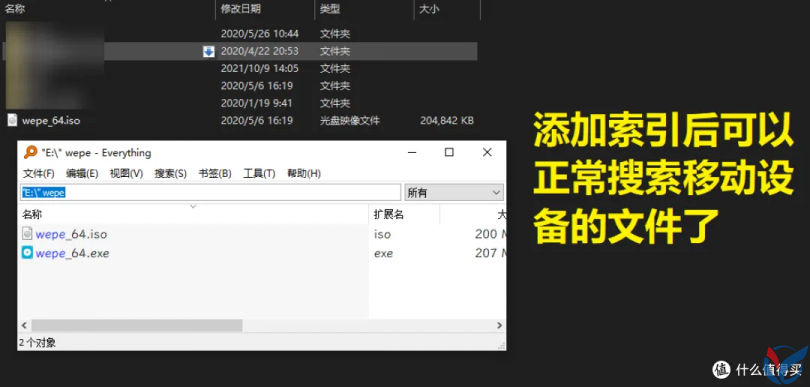 但是假如说你插入了一块移动硬盘或者U盘,并且这些移动设备的文件系统格式并不是 NTFS 时,那么此时 Everything 是不会对这些移动硬盘或者U盘建立索引的,换句话说就是无法对这些移动设备上的文件进行搜索,如下面的例子: