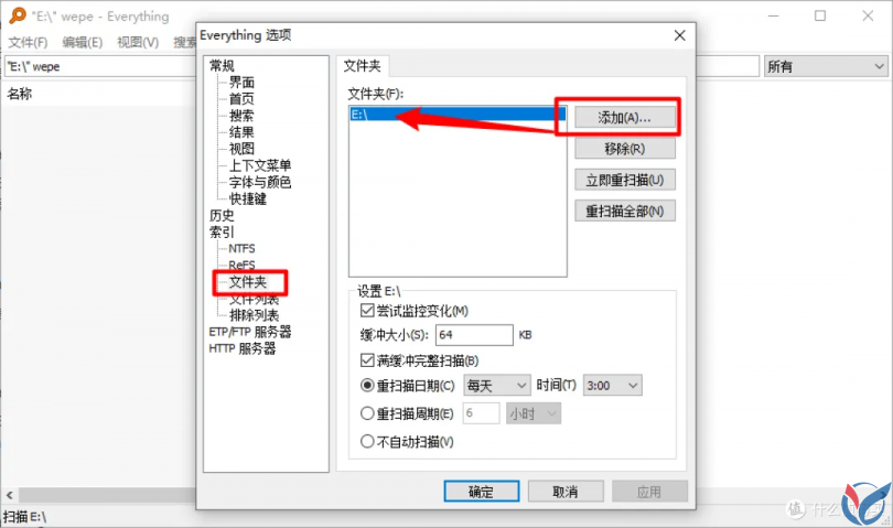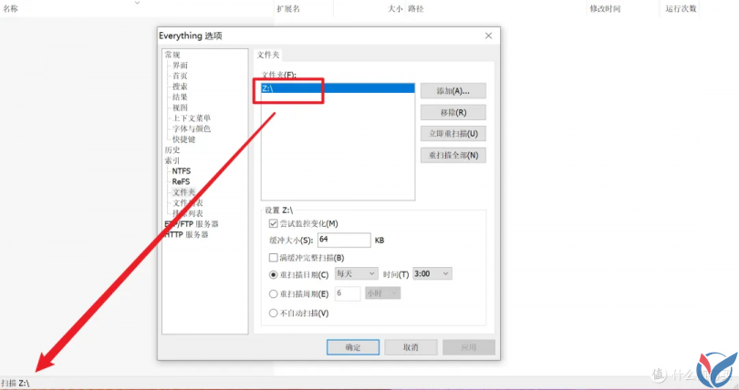 | 自动索引 NTFS 固定卷 | 启用后,Everything 将自动添加所有 NTFS 分卷到索引。禁用此项以手动添加。 |