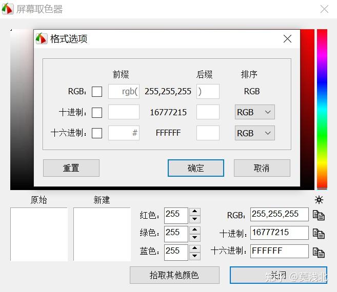 上面提到的 QQ 截图也可以取色,但只支持 RGB 格式的,无法切换为 HEX(十六进制)的,这个功能并不好用。因为很多软件的设置中,RGB 是分开设置的: